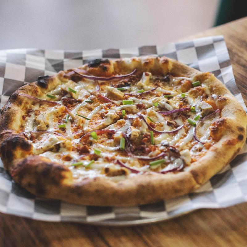 Buffalo sauce, shredded mozzarella, chicken, bacon, red onions, ranch, and chives | $14 / 19 / 24