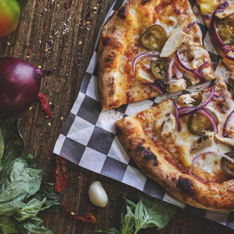 BBQ sauce, shredded mozzarella, chicken, red onion, jalapeño, pineapple | 14 / 19 / 24
